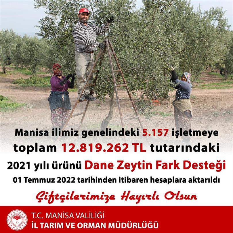 Çiftçilerimize ait Dane Zeytin Fark Ödemesi desteği 01.07.2022 Cuma günü saat 18:00 itibariyle çiftçi hesaplarına aktarılmıştır. Bu destek için toplamda 5.157 çiftçimize 12.819.262,25 TL ödeme yapılmıştır. Çiftçilerimize hayırlı ve bereketli olmasını dileriz.